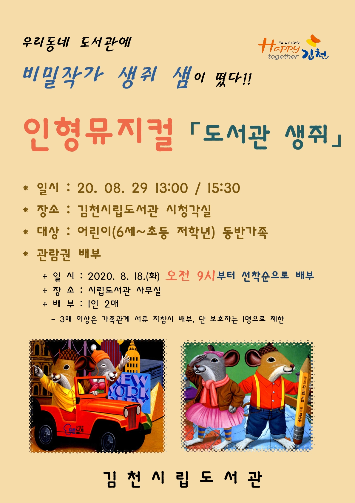 | 김천시립도서관에서는 오는 8월 29일 오후 1시, 3시 30분 2회에 걸쳐 시립도서관 시청각실에서 어린이 인형뮤지컬 <도서관 생쥐>를 공연한다.