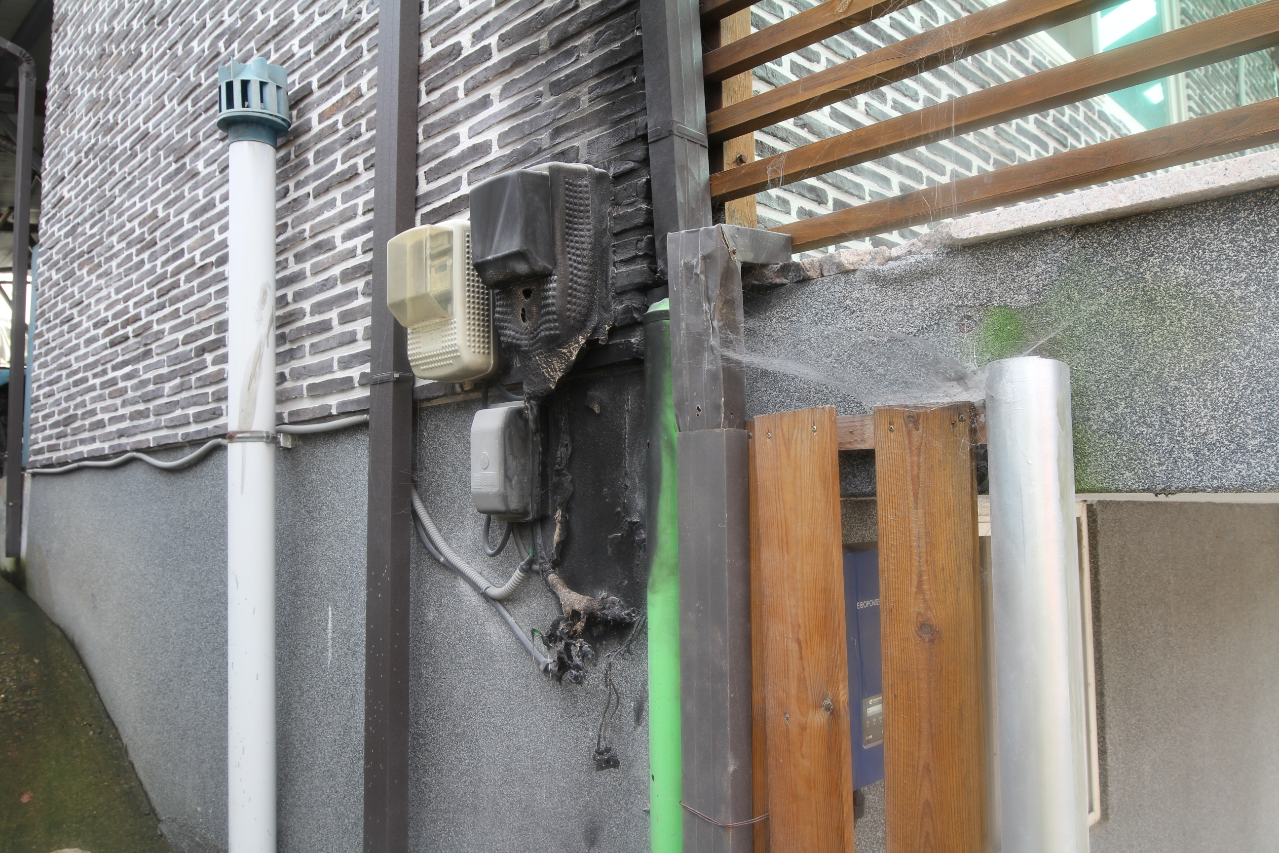 신고자 박모씨는 인근 주차장에서 물품 적재 중 화재가 발생한 것을 목격하고 119에 신고한 상황이며, 밖에서 사람들의 소리에 강모씨가 주택 내에 있던 소화기를 사용하여 전기 컨트롤박스에서 지붕으로 연소 확대 되는 화재를 초기 진화하였다.