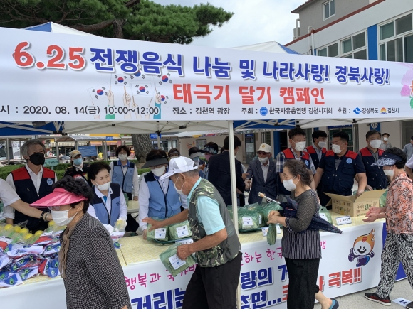 | 한국자유총연맹 김천시지회(이하 자총)는 지난 14일(금) 김천역 광장에서 6.25전쟁음식 나눔 및 나라사랑! 경북사랑! 태극기 달기 캠페인을 가졌다. 여상규 자총회장을 비롯한 회원 30여명이 행사를 진행했고 김충섭 김천시장, 이우청 김천시의회 의장이 함께 참여했다.