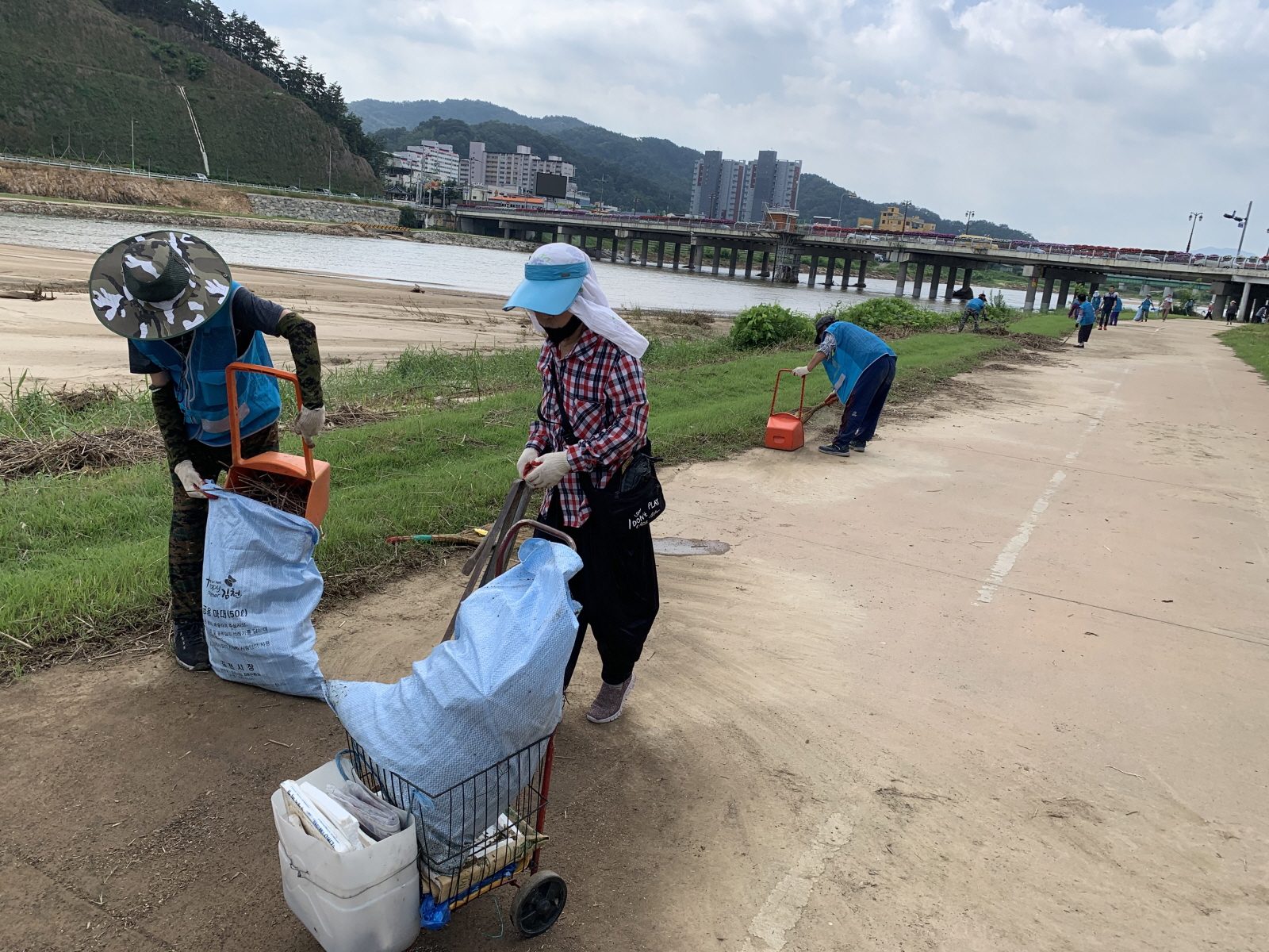 | 김천시 자산동은 지난 14일 긴 장마와 태풍‘장미’의 집중호우로 인하여 하천이 범람하면서 발생된 김천교 둔치의 각종 쓰레기와 나뭇가지 등을 수거하였다.