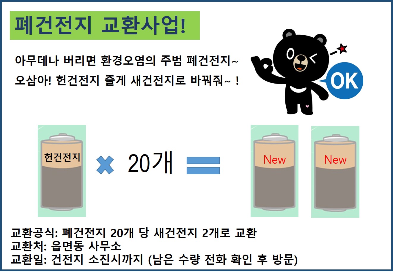 본 사업은 가정에서 사용한 폐건전지 20개를 읍면동 주민센터에서 새건전지(AA, AAA 중 선택) 2개로 교환해 주는 사업으로 폐건전지는 알칼리, 리튬, 니켈, 망간 등 종류 상관없이 교환가능하며 김천시 전체 10,000개 물량을 소진 시까지 진행한다.