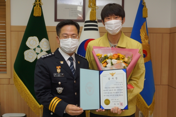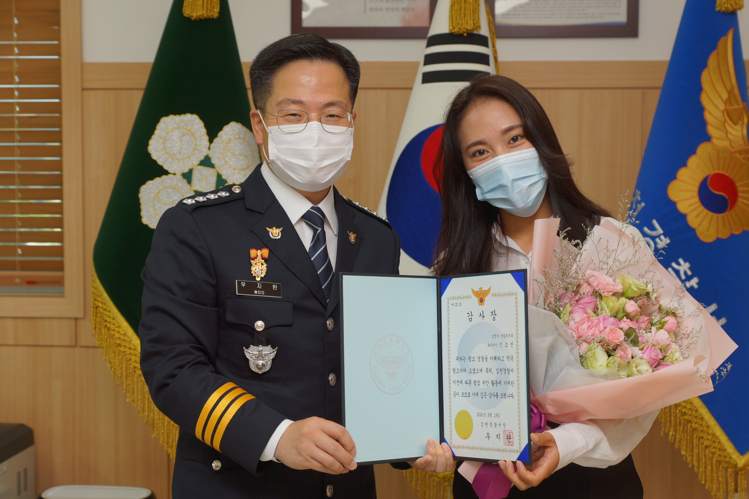 | 김천경찰서(서장 우지완)는 지난 19일 경찰서 신청사 이전 및 지역공동체치안햡의체 활성화에 도움을 준 김천시청 산림녹지과 신소연(녹지서기), 정보기획과 조용흠(전산서기보)에게 경찰서장 감사장을 수여했다.