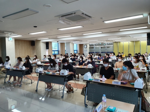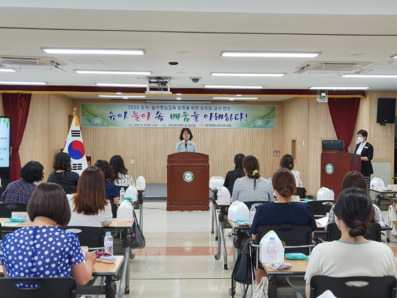 | 경상북도김천교육지원청(교육장 마숙자)은 8월20일(목)에 공․사립 유치원 교사 50명을 대상으로 김천교육지원청 대회의실에서 ‘유아 놀이 속 배움을 이해하다’라는 주제로 유치원 교사 연수를 실시하였다. 이번 연수는 영진전문대학교 송혜영 강사의 ‘유아교육의 본질과 놀이에 대한 이해’라는 주제로 놀이에 대한 바른 이해를 통해 유아교육의 정체성을 회복하고 유아 스스로 자유롭게 선택한 놀이가 수용되는 놀이 중심 환경이 무엇보다 중요함을 강조하였다. 또한 교육공동체 중심의 소통과 협력이 필요하며 실제 놀이 관찰 방법과 놀이 일지 기록 등 현장의 문제점을 함께 고민해보는 시간을 가졌다.