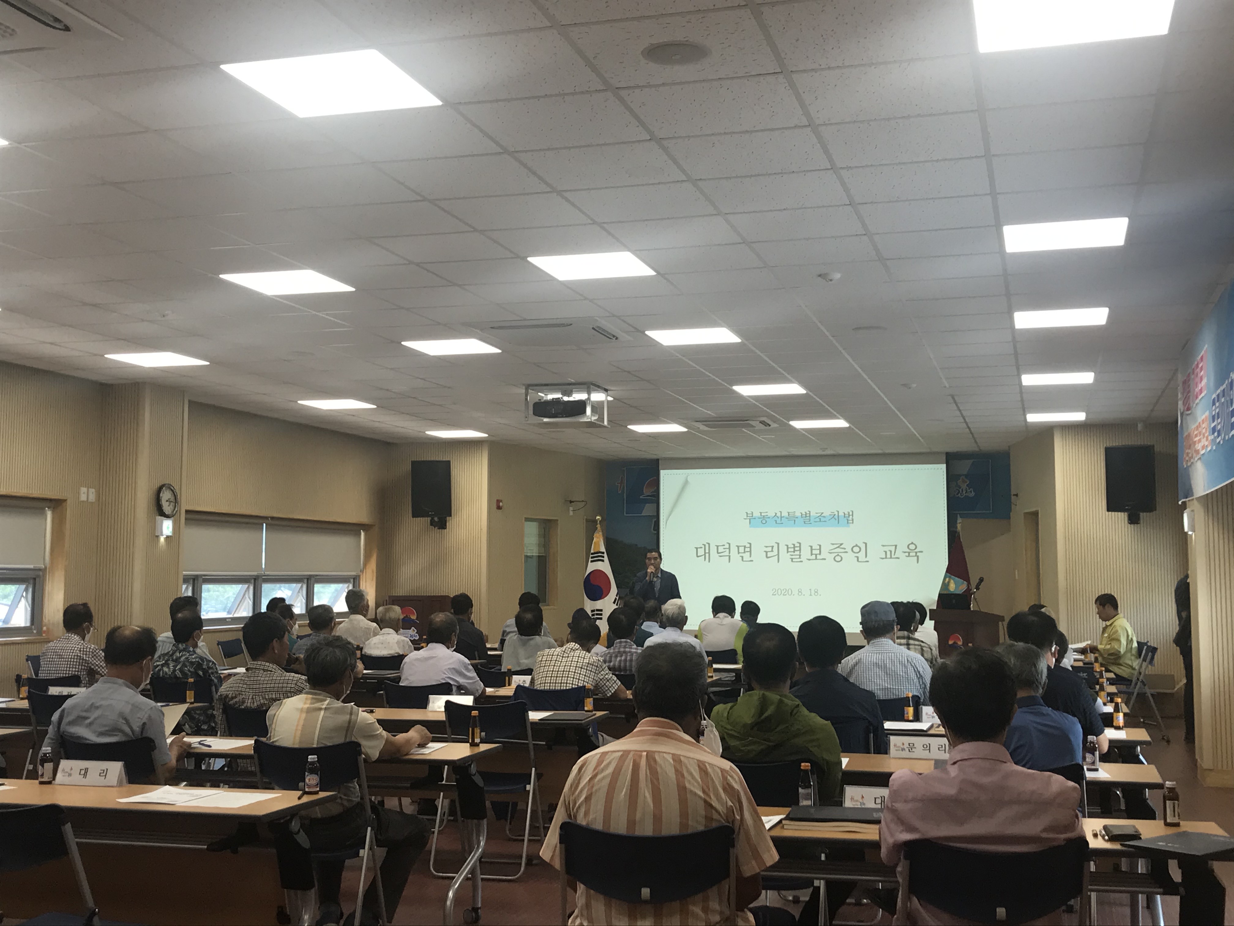 | 대덕면사무소(면장 이원용)는 지난 18일 면사무소 3층 회의실에서 2020년 「부동산소유권 이전등기 등에 관한 특별조치법」시행에 따른 리별 보증인 53명을 위촉하고 보증업무 직무 교육을 실시했다.