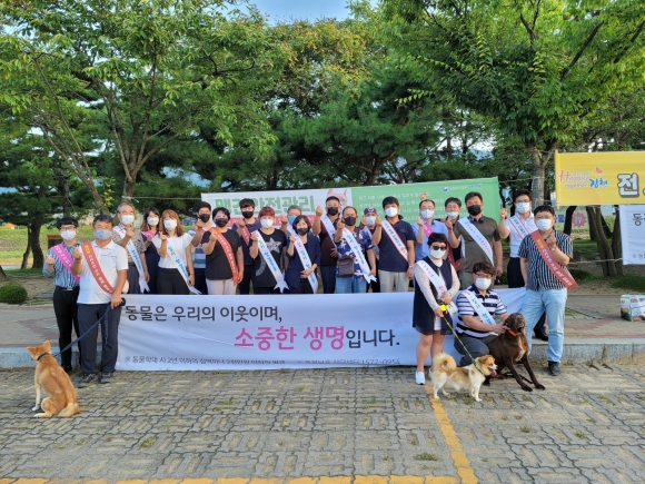 | 김천시(시장 김충섭)는 지난 19일 강변공원 일대에서 사람과 동물이함께 행복한 김천 만들기 일환으로 ‘성숙한 반려동물 문화조성’을 위한 동물보호 홍보 캠페인을 실시했다.