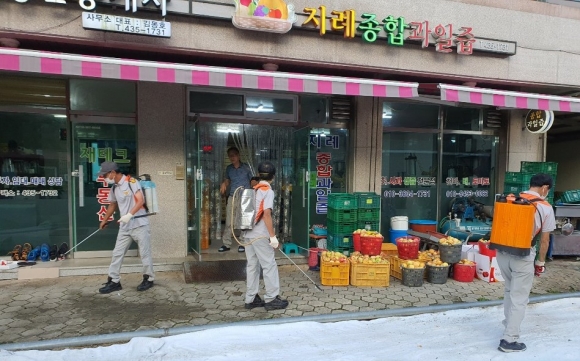 흑돼지 식당가를 비롯한 장터길 상가와 대산농협, 우체국 등 주민들과 외부인들의 방문이 많은 시설들 내외부와 마을회관 및 버스정류장을 집중적으로 방역하였다.