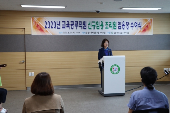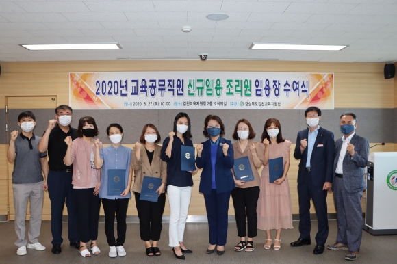 | 김천교육지원청(교육장 마숙자)은 8월 27일(목) 오전10시 2020. 9. 1.자 임용예정인 교육공무직 신규 조리원 5명을 대상으로 임용장 수여식을 개최했다.