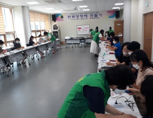 코로나 19 예방수칙을 준수하기 위해 입구에서 발열체크는 물론 손 소독과 개인간 거리두기를 실천하면서 진행된 행사는 첫날 부녀회원 20여명이 먼저 참여하여 실습을 통해 만들기 과정을 익힌 다음 둘째날은 일반시민들에게 재능을 기부하는 형식으로 진행됐다.