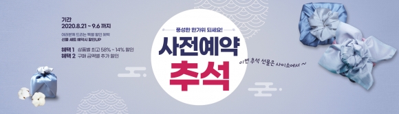 먼저, 이번 기획전을 통해 9월 6일까지 추석 선물세트를 사전 예약구매 시 3만원, 6만원, 10만원 구간별로 최소 6천원부터 2만원까지 할인쿠폰을 즉시 제공한다. 사전예약 품목은 한우, 한과, 홍삼절편, 곶감 등 20개 업체 20품목으로 준비돼 있다.