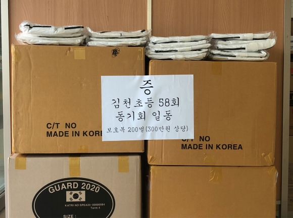 | 김천시(시장 김충섭)은 8월 30일 김천초등학교 58회 동기회에서 코로나19 확산 방지와 대응요원들의 안전을 위해 써달라며 보호복 200개(300만원 상당)를 기부하였다고 밝혔다.