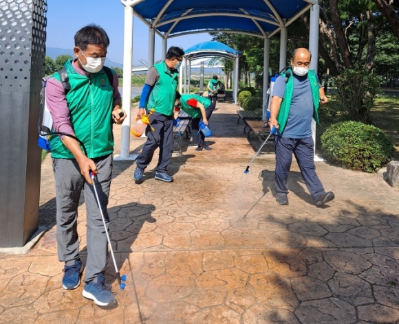 이번 방역 활동은 9월 4일(금) 오전 9시에 진행되었으며, 강변공원 대로변 과 쉼터, 벤치 등을 소독하고, 근처 주민들에게 사회적 거리두기 및 생활방역 수칙 준수에 대한 홍보도 진행하였다.