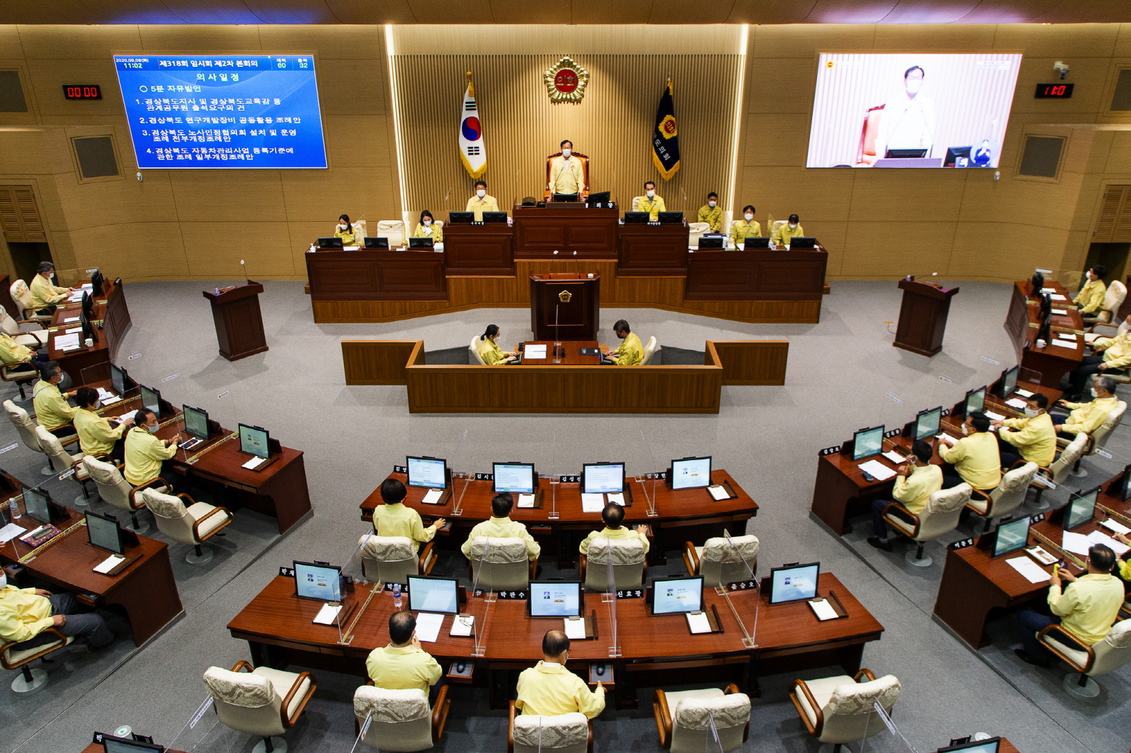 또한 비말차단을 위한 애국가 제창을 생략하고 녹음반주로 진행하였으며 본회의장내 모든 좌석에는 비말차단용 투명가림막을 설치하였다. 각 상임위 회의실에도 비말차단용 투명가림막과 함께 집행부 관계자 좌석을 1m이상의 거리를 두고 설치하였다.