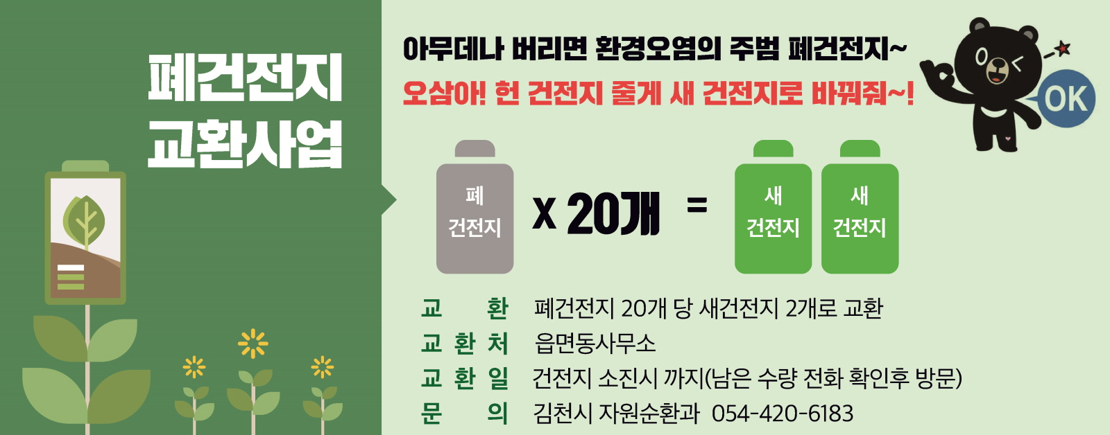 본 사업은 가정에서 사용한 폐건전지 20개를 읍면동 주민센터에서 새건전지(AA, AAA 중 선택) 2개로 교환해 주는 사업으로 폐건전지는 알칼리, 리튬, 니켈, 망간 등 종류 상관없이 교환가능하며 김천시 전체 10,000개 물량을 소진 시까지 진행한다.