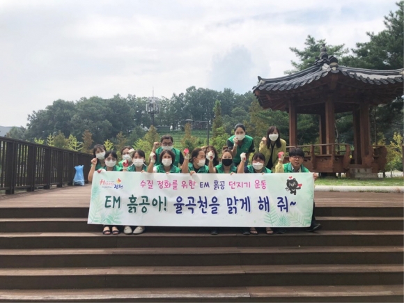율곡동의 저수지에 흙공을 투입하며 수질정화를 통한 율곡천 살리기 운동을 실천하기 위한 취지로 진행된 이번 행사는 지난 6월 19일과 7월 23일 부녀회원들이 정성들여 만들어 2 ~ 3개월의 건조과정을 거친 흙공으로 행사를 진행했다. EM 흙공은 황토와 천연 발효액을 섞어 공으로 만들고 발효시킨 것으로 효모, 유산균, 광합성세균 등 미생물 성분이 포함되어 있어 오염된 하천 바닥에 퇴적된 물질과 각종 오염원들을 제거해 수질개선은 물론 악취 제거에도 탁월한 효과가 있다. 이서현 새마을부녀회장은 “그동안 애지중지 보살피며 건조시켜 온 흙공이 드디어 제 역할을 하게 되어 너무 기쁘고, 율곡천을 깨끗하게 정화할 수 있다고 생각하니 너무 기분이 좋다.”고 말했다. 이우문 율곡동장은 “이번 행사는 코로나-19로 모두가 어려운 시기에 회원들이 직접 만든 흙공으로 율곡천의 수질 환경을 되살리자는 취지로 주민들이 내 지역의 환경도 살리고, 다 같이 행복해지는 Happy together 김천운동도 실천하는 계기가 되었다.”며 말했다. 한편, 율곡동 새마을부녀회원들은 이외에도‘네일아트’,‘한복방향제 만들기’,‘김치만들기’행사 등 주민들을 위한 다양한 행사를 준비하여 Happy together 김천운동 실천을 위해 다양한 노력을 하고 있다.