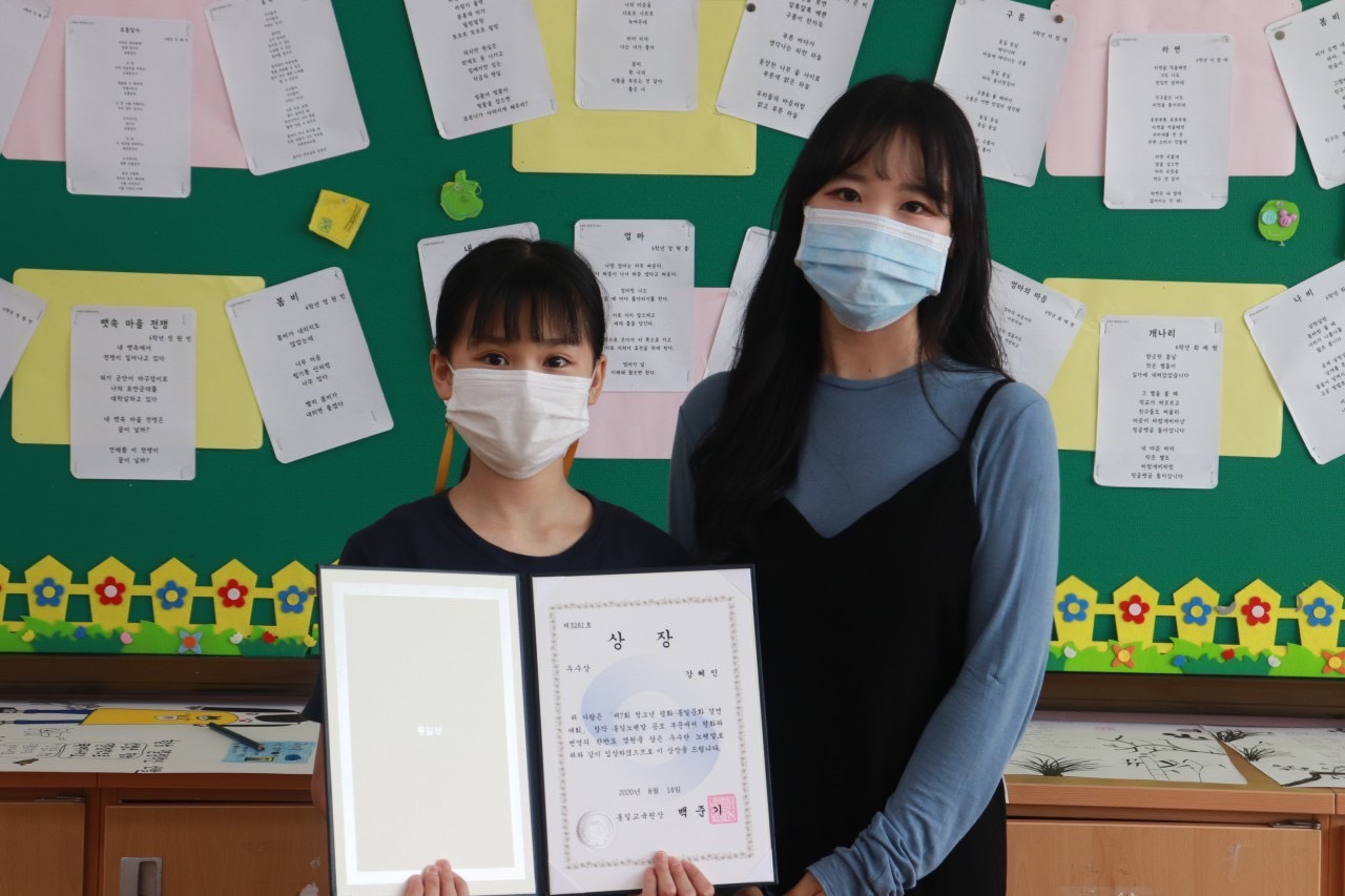 | 감천초등학교(교장 이기협) 6학년 강혜인 학생은 통일부에서 개최하는 『제7회 청소년 평화 통일문화 경연 대회』 창작 통일노랫말 공모 부문에서 평화와 번영의 한반도 염원을 담은 우수한 노랫말로 우수상을 받았다.