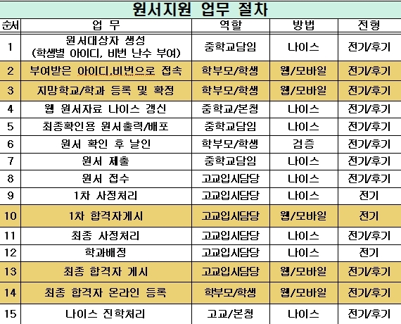 나이스 기반의 웹(모바일) 온라인 고입전형 시스템은 원서 작성(학생‧학부모)→원서 제출과 접수(학교)→합격자 게시→합격자 등록까지 원스톱 서비스를 제공한다.
