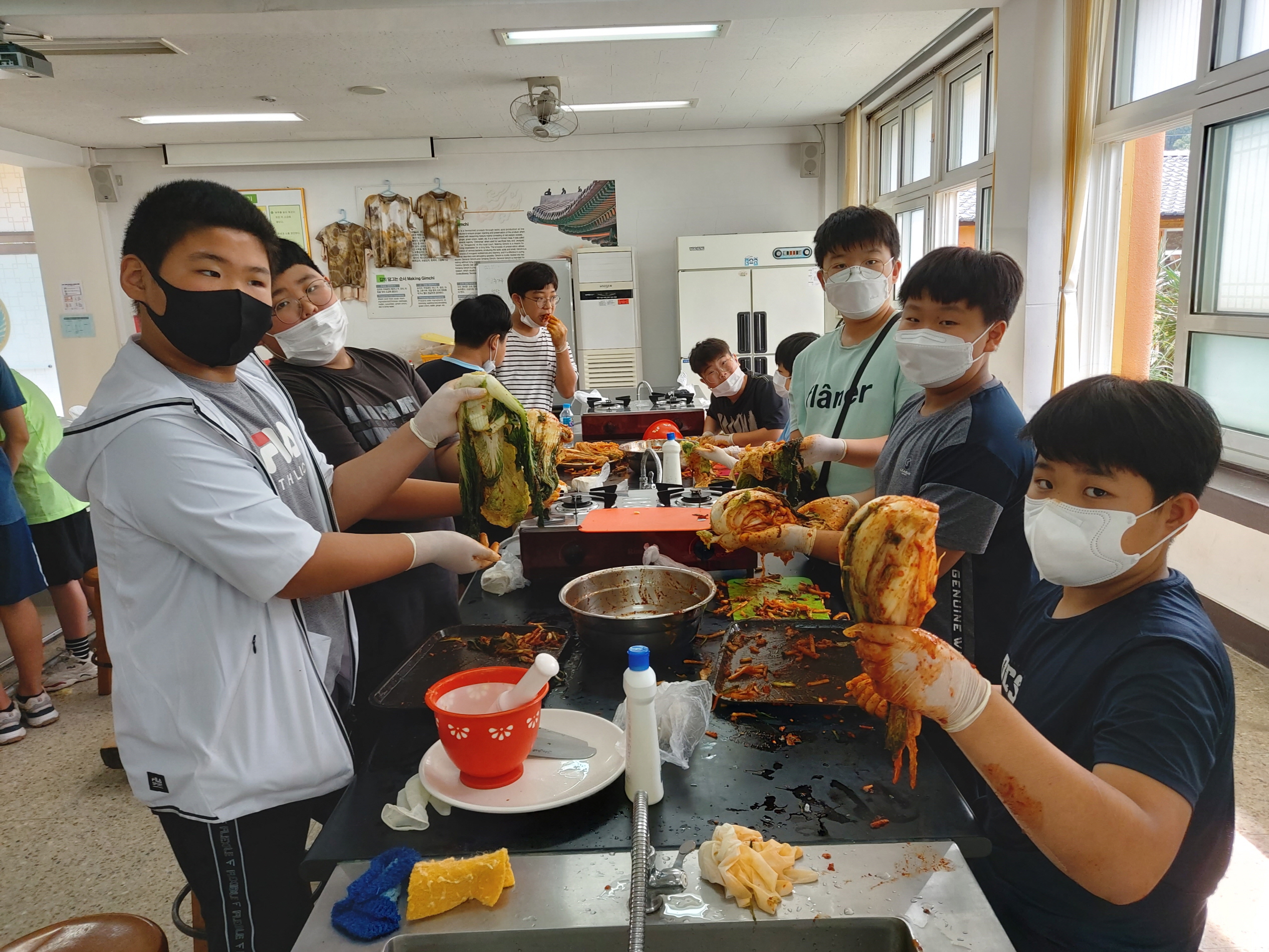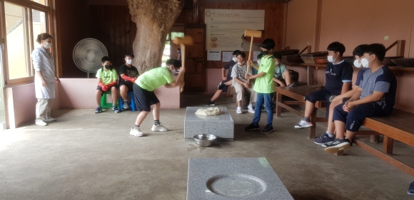 첫째 날은 본교 5~6학년 17명 학생이 전통체험학교를 방문하여 맷돌을 활용하여 전통적인 방법으로 두부만들기, 전통발효음식의 우수성과 전통 먹거리를 알아보는 김치만들기, 떡메를 이용하여 인절미 만들기 활동을 하였다.