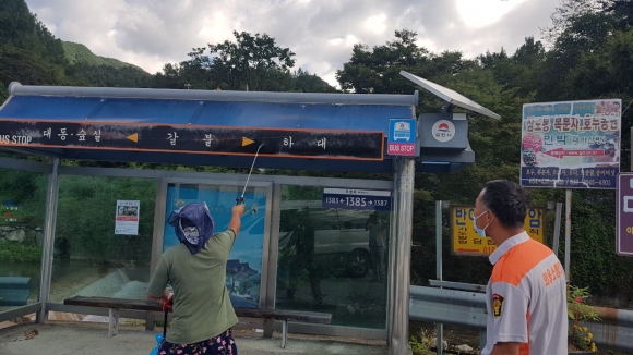 | 부항면 의용소방대(회장 신춘식)는 9월 14일 9명의 회원이 이른 아침부터 코로나-19 예방을 위한 방역 활동을 실시했다. 관내 버스승강장 27개소에 방역을 함과 더불어 하천 주변의 각종 쓰레기 등을 함께 수거하는 등 Happy Together 김천 운동을 적극 실천하는 모습을 보였다.