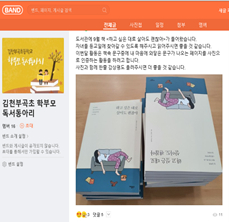 김천부곡초 학부모 온라인 독서동아리는 15명의 회원으로 구성되어 있으며, 네이버 밴드를 개설해 함께 읽을 책을 정하고 독서 후 자유롭게 의견을 나누고 있다.