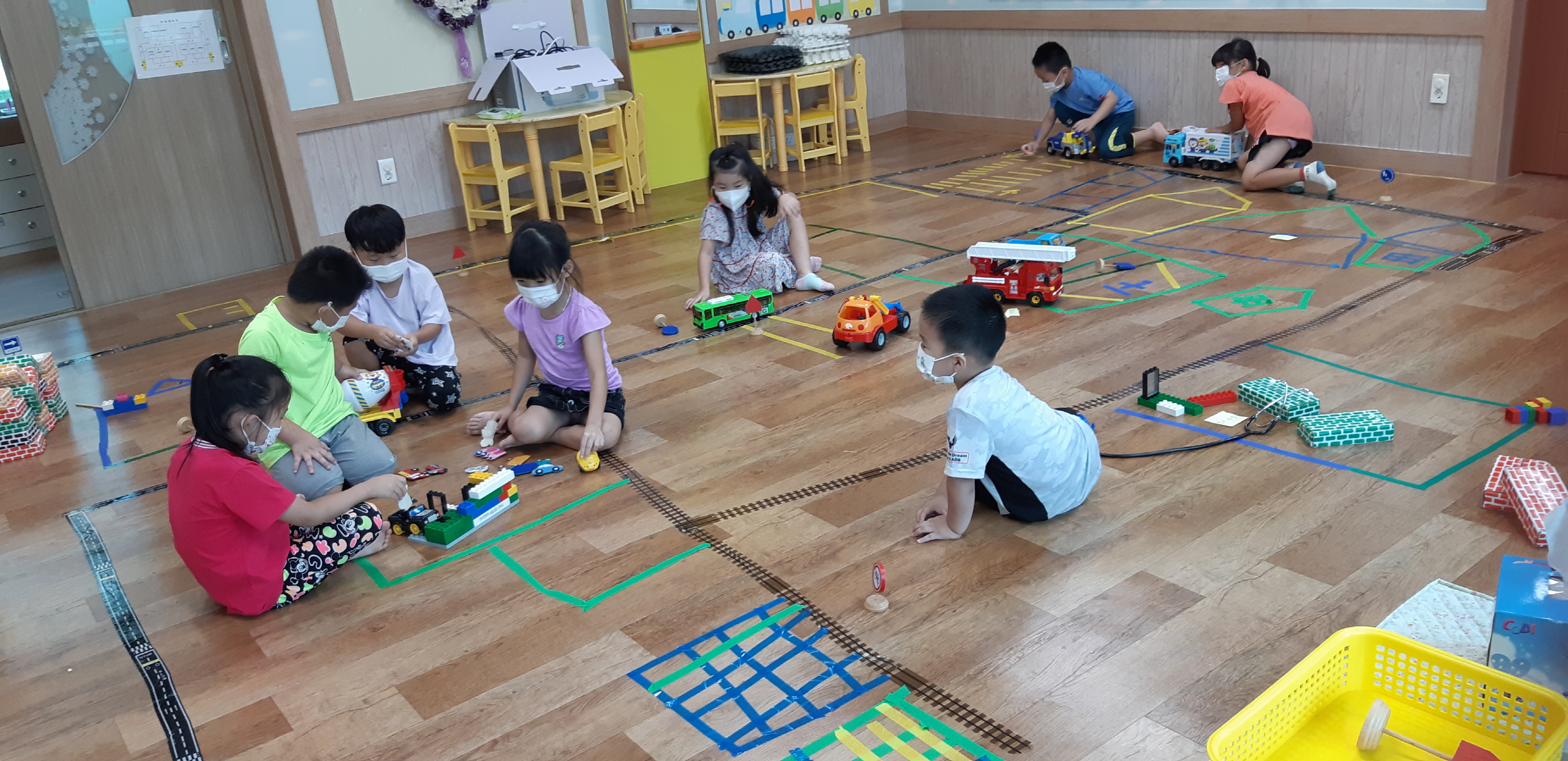 9월 2주에는 현장학습을 통해 경험한 것들을 생각하며 교실 공간에 도로 만들기, 주차공간 만들기, 주유소 만들기, 정비공장 만들기 놀이를 하면서 너무나도 즐거워하였고 적극적으로 참여하는 모습이 참 예뻤다. 특히 장애인 주차공간을 테이프로 붙여 만든 것은 정말 인상 깊었다. 친구들 모두 놀랄 정도였다. 이렇게 유아들의 교육과 놀이를 통해 표현된 창의성과 상상력은 교사까지 깜짝 놀라게 하였다.