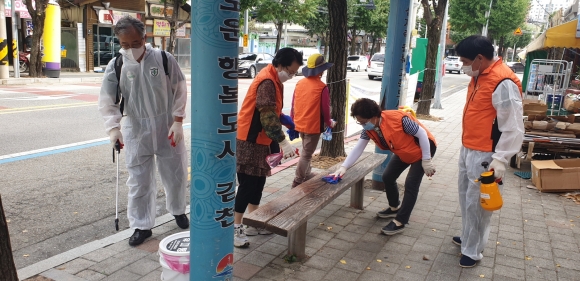 | 양금동 지역사회보장협의체는 9월 18일 코로나-19 확산 방지를 위한 방역 소독을 실시하였다. 이번 방역소독은 버스정류장, 공중화장실, 실외운동시설 등 다중이용장소를 중점적으로 실시하였다. 특히, 엘리베이터 내부 및 문고리 손잡이 등 사람의 손이 많이 닿는 곳은 꼼꼼히 소독하였고, 회원들은 주민들에게 거리두기 및 개인위생 수칙 준수 등을 당부하기도 하였다.