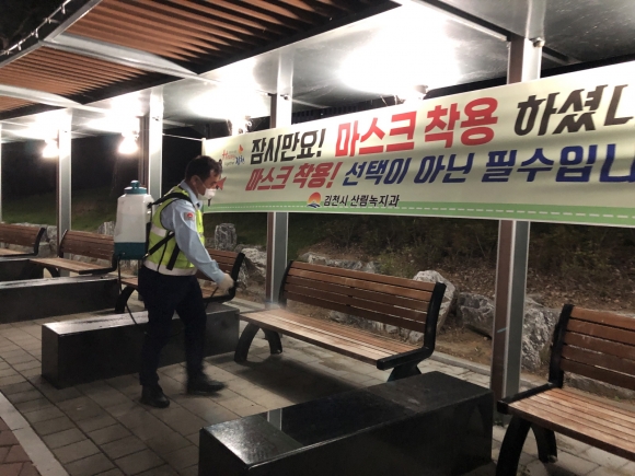 | 김천시 율곡동(동장 이우문)은 9월 22일 저녁 자율방범대(대장 최환필) 주관으로 회원 10여명이 참석한 가운데 관내 공원 시설물을 중심으로 코로나19 지역 확산 방지를 위한 방역을 실시했다고 밝혔다.