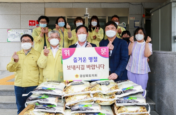 | 경상북도의회 고우현 의장과, 박영서 의원(기획경제위원회)은 9월 23일(수) 추석 명절을 앞두고 문경시 문경읍에 위치한 사회복지 시설인 ‘문경시립노인간호전문센터’ 를 방문하여 어르신들이 따뜻한 추석 명절을 보낼 수 있도록 정성들여 준비한 위문품을 전달하는 뜻깊은 시간을 가졌다. 또한 코로나19 전염 방지를 위해 기존에 실시해 오던 복지시설 내 방문 대신 관계자 애로사항 청취와 격려를 실외에서 간소하게 진행하였다.