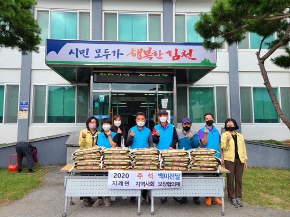 | 김천시 지례면지역사회보장협의체(위원장 이상경)는 2020년 9월 23일 지례면에 거주하고 있는 독거노인과 장애인 20가정에 백미를 전달하며 위문하였다.