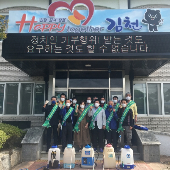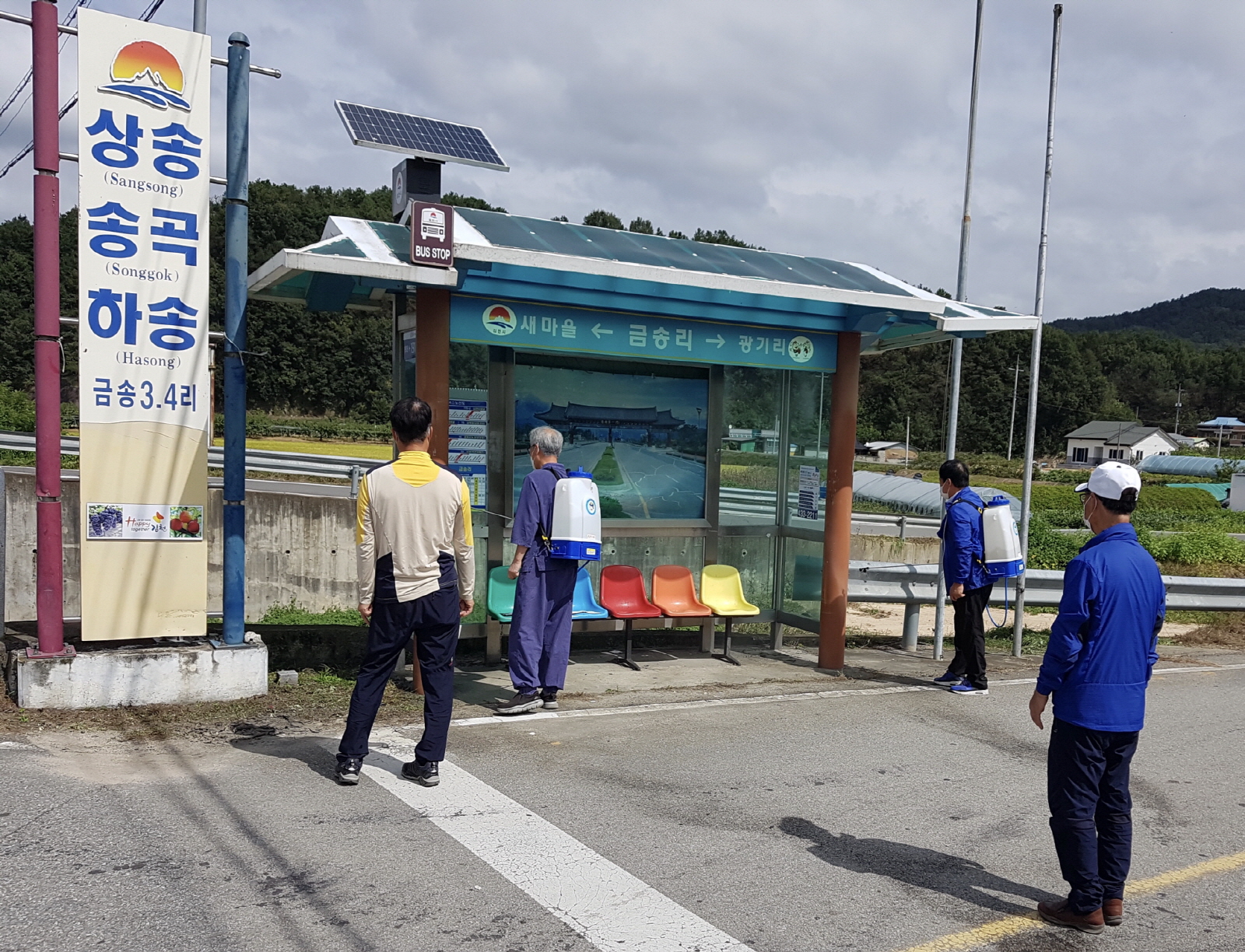 | 감천면 이장협의회(회장 천병수) 회원 14명은 9월 24일 오전 추석 명절 귀성·역귀성 자제 홍보 및 코로나19 확산 방지를 위해 버스승강장 등 방역활동을 실시하였다.