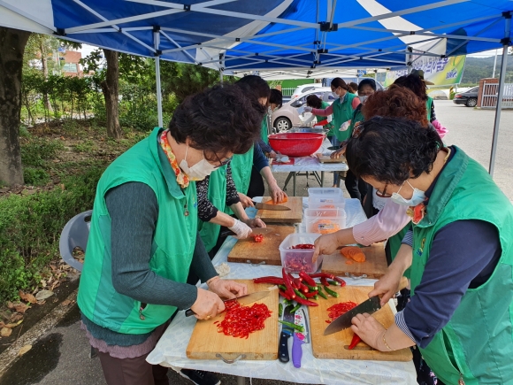 물김치, 버섯 꽈리고추 조림, 소고기 메추리알 장조림, 우엉조림 등 4가지반찬을 준비하기 위해 이른 아침부터 참석한 새마을부녀회원들은 코로나19 예방 수칙을 준수한 가운데 봉사활동에 참여했다.