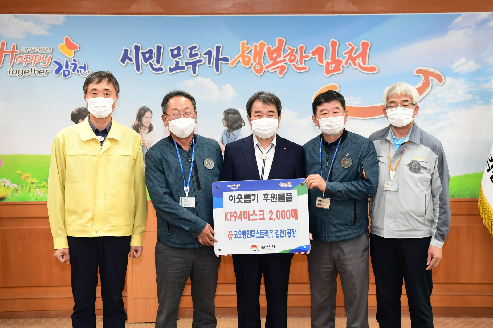 | 코오롱인더스트리(주) 김천1공장(공장장 김용섭)은 28일 김천시에 KF94 마스크 2,000매를 기탁했다. 이 날 마스크 기탁을 위해 김천시청을 찾은 김용섭 김천1공장장, 송성근 공제회장, 협력업체 신승호 대표는 민족고유의 명절 추석을 맞아 장애인복지관 및 취약계층 지원에 사용해달라며 마스크를 전달했다.