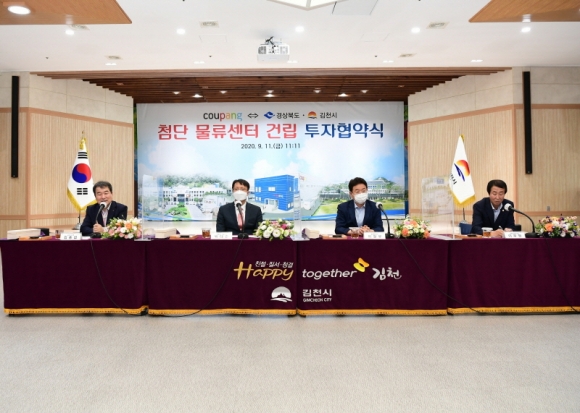 | □첨단 물류센터 1,000억원 투자양해각서 체결 ❍ 김천시와 쿠팡(주)은 지난 9월 11일 김천시청 3층 강당에서 김충섭 김천시장과 이철우 경상북도지사, 쿠팡(주) 박대준 대표 등 관계자 40여명이 참석한 가운데 첨단 물류센터 건립을 위한 투자양해각서를 체결했다.