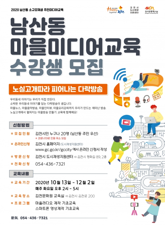| 김천시(시장 김충섭)는 남산동 소규모재생사업 추진에 따른 마을미디어 수강생을 모집한다.