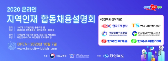 | 경상북도는 이전공공기관의 지역인재 채용 확대와 취업촉진을 위해 10월 7일부터 11월 30일까지 ‘2020년 온라인 지역인재 합동채용설명회’를 국토교통부, 국가균형발전위원회와 함께 개최한다.