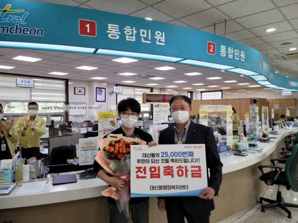 | 대신동(동장 전제등)에서는 지난 7일 오후1시경 직원들과 함께 2만5천번째 주민의 전입을 축하하고 전입축하지원금을 전달하는 깜짝 이벤트를 가졌다.