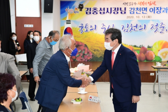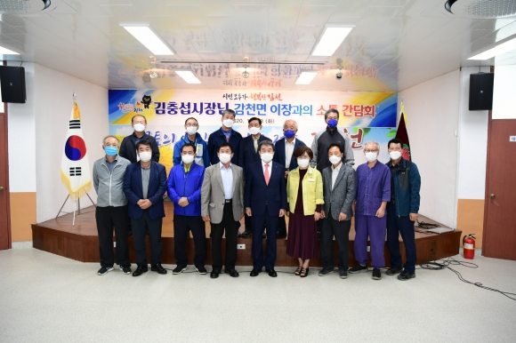 | 김충섭 김천시장은 10월 13일 오전 감천면사무소 2층 회의실에서 행정의 일선에서 헌신하고 있는 이장들을 격려하기 위해 소통 간담회를 개최했다. 이번 소통 간담회는 코로나19 대응을 위한 각종 사업 추진에 헌신하고 있는 이장들을 격려하고, 주요 현안 사업에 대한 여론 및 각종 애로사항을 청취하고 시정에 반영함으로써 소통 행정을 구현하고자 시간을 마련하였다. 또한, 코로나19 감염병 유행으로 미뤄졌던 임기만료 이장님들께 감사패 전달식도 행해졌다.