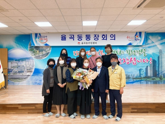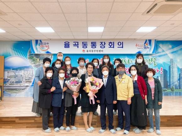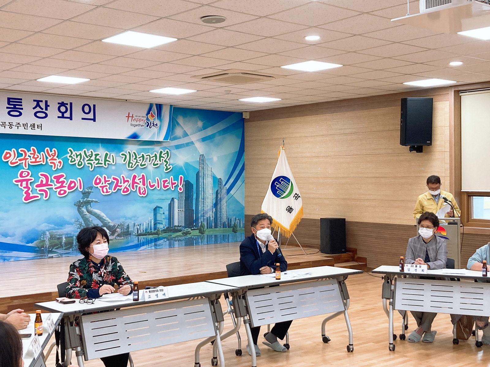 | 김천시 율곡동(동장 이우문)에서는 10월 13일 2층 회의실에서 통장협의회 회원 30명과 박해수 시의원, 신장호 복지환경국장이 참석한 가운데 시정의 주요 현안에 대해 시민들의 다양한 의견을 수렴하고, 3분기 시정유공 민간인을 표창하기 위한 통장회의를 개최했다고 밝혔다. 통장회의를 시작하기에 앞서, 3분기 모범시민인 김해숙(율곡동 자연보호협의회 부회장), 곽숙희(율곡동 새마을부녀회 부회장)에 대한 표창패 수여식이 진행됐다. 시상은 김충섭 김천시장을 대신하여 신장호 복지환경국장이 전달했다. 신장호 복지환경국장은 수상자들에게 축하말씀을 전하는 한편, 최근 김천시의 쿠팡 첨단물류센터 유치 쾌거, 국내 리쇼어링 1호 기업 ‘아주스틸’김천공장 착공, 시청~혁신도시간 강남북연결도로 공사 상황, 복합혁신센터 부지 주차이동 협조 등 다양한 시정 소식을 전하며 시에서 추진중인 시책에 많은 관심과 지지를 부탁했다.