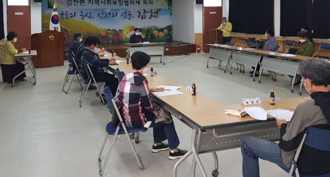 | 코로나19에 따른 사회적 거리두기가 1단계로 하향 조정됨에 따라 지난 8월에 출범한 제4기 감천면 지역사회보장협의체(이하 보장협의체)의 정기회의가 10월 15일 감천면사무소에 2층 회의실에서 개최되었다.