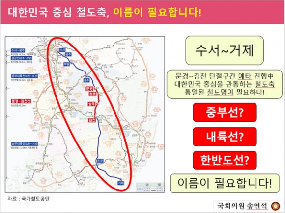 | 송언석 의원은 “경부선 KTX의 운영여력이 거의 없기 때문에, 수서~거제 노선의 새로운 철도축이 빠른 시일 내 완성되어야 한다”고 밝히면서 “이 노선의 새로운 이름을 가칭 중부선, 내륙선, 한반도선 등으로 빨리 확정해야 한다”고 덧붙였다.