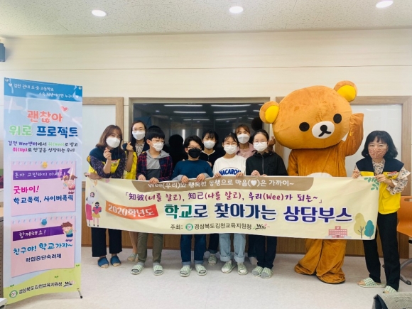 | 경상북도김천교육지원청(교육장 마숙자) Wee센터는 10월 7일(수), 16일(금)에 개령초등학교와 어모중학교에서 학생 50여명을 대상으로 ‘知彼(너를 알고), 知己(나를 알고), 우리(Wee)가 되는’ 학교로 찾아가는 상담부스를 운영하였다.