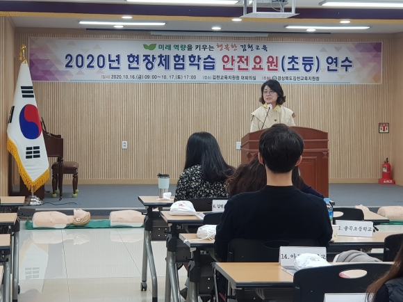| 김천교육지원청(교육장 마숙자)은 10월 16일(금)과 17일(토) 이틀 동안 관내 초등학교 선생님 27명을 대상으로 김천교육지원청 대회의실에서 「2020 현장체험학습 안전요원 연수」를 실시하였다.