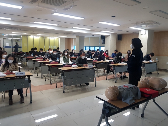 연수의 주요 내용은 ▸사고 시 대처요령 ▸심폐소생술 및 자동제세동기 사용 실습 ▸수상․교통안전 교육 ▸재난안전 교육 ▸상처치료 및 붕대 사용법 등으로 실습과 체험 위주로 구성되었다.