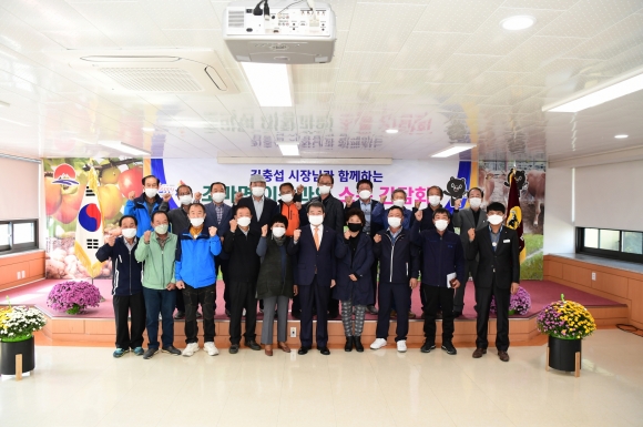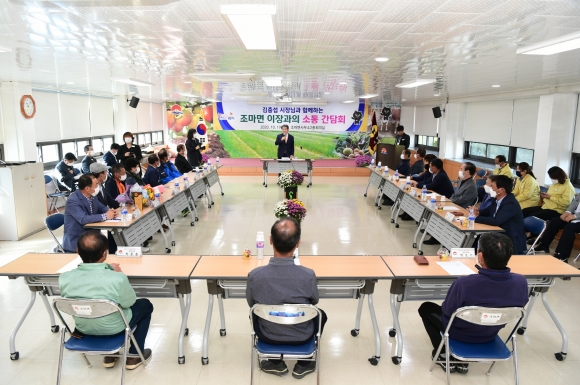 | 김천시(시장 김충섭)는 10월 19일 조마면사무소 2층 회의실에서 19개 마을이장들과 함께 시정발전을 위한 현장의 목소리를 듣고자 소통 간담회를 개최했다. 이번 소통 간담회는 행정의 최전선에서 주민과 행정의 가교역할을 성실히 수행하고 있는 이장들의 노고를 격려하고 애로사항 청취 및 시정 건의사항을 청취하여 지역 현안에 대해 소통하고 공유하는 시간을 갖고자 마련됐다. 이 날 행사는 ▲임기만료 이장 감사패 전달 ▲2020년 3분기 시정 유공 민간인 표창패 수여 ▲면정 건의사항 및 간담회가 진행됐으며 지역 현안에 대해 다양한 의견과 함께 시장과 이장의 딱딱한 거리감을 허물고 허심탄회하게 대화를 나누는 시간을 가졌다.