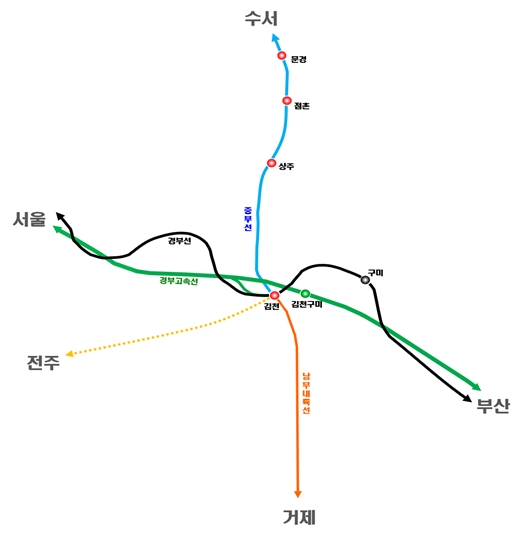 김천역은 경부선과 중부선의 하나인 남부내륙선, 중부내륙선 그리고 향후 건설계획인 전주~김천간 철도노선이 경유하는 사통팔달 철도교통의 결절점(Node, 요충지) 임을 고려할 때, 경상북도 서측의 철도관문 역할을 하는 김천역의 철도교통 허브로써의 위상 제고가 필요한 실정이다.