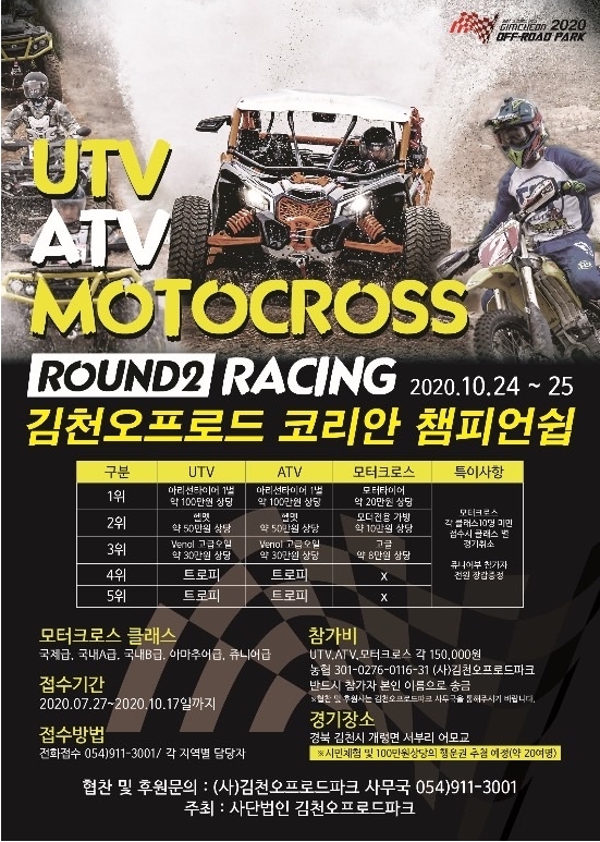 UTV(Utility Task Vehicle·다목적 차량)·ATV(All-Terrain Vehicle)·모터크로스 (점프 등 묘기용 오토바이) 등 3개 종목으로 진행되는 이번 대회는 안전사고 방지를 위해 레이싱 슈트와 헬멧·글러브·라이딩 부츠 착용이 필수이며 각 부문 우승자에게는 100만원 상당의 상품이 주어진다.