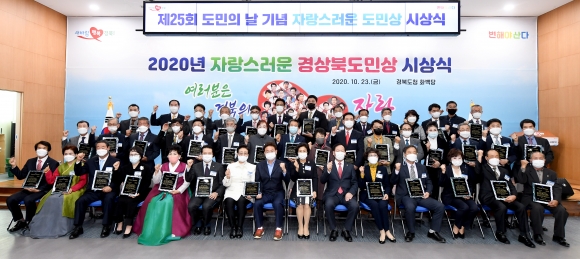 | 경상북도는 23일 도청 화백당에서 이철우 경상북도지사, 고우현 경상북도의회 의장, 수상자 및 가족 등 100여명이 참석한 가운데 2020년 경상북도민의 날 기념 ‘자랑스러운 경상북도민상 시상식’을 가졌다.