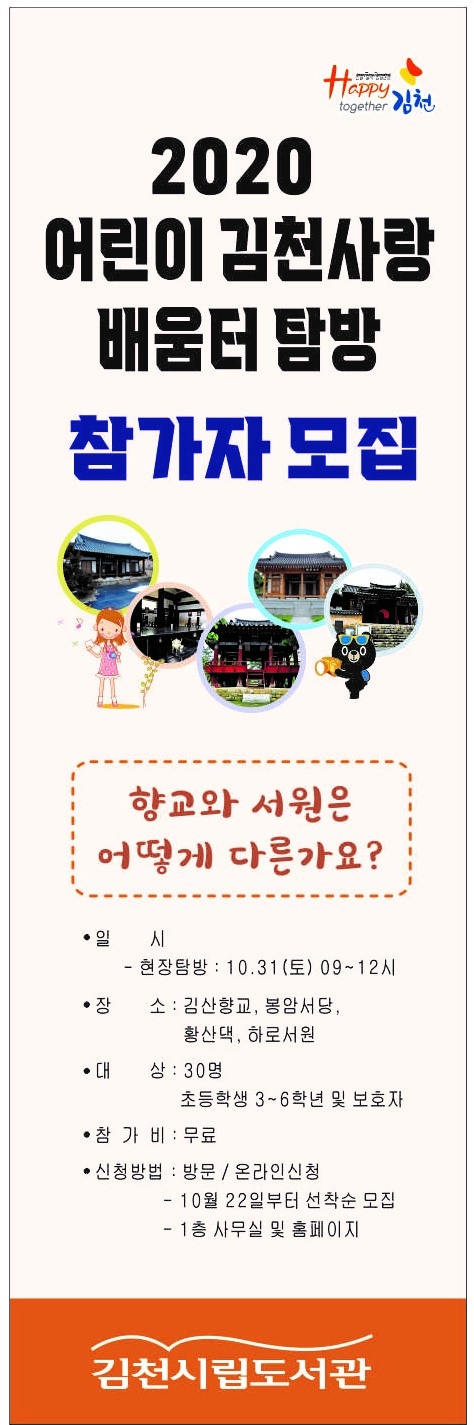 | 김천시립도서관(관장 김영욱)은 오는 10월 31일 토요일, 초등학생을 대상으로 지역 문화 유적지를 탐방하는 ‘어린이 김천사랑 배움터’ 프로그램을 운영하며, 우리고장의 향교와 서원을 함께 방문할 어린이를 모집한다.