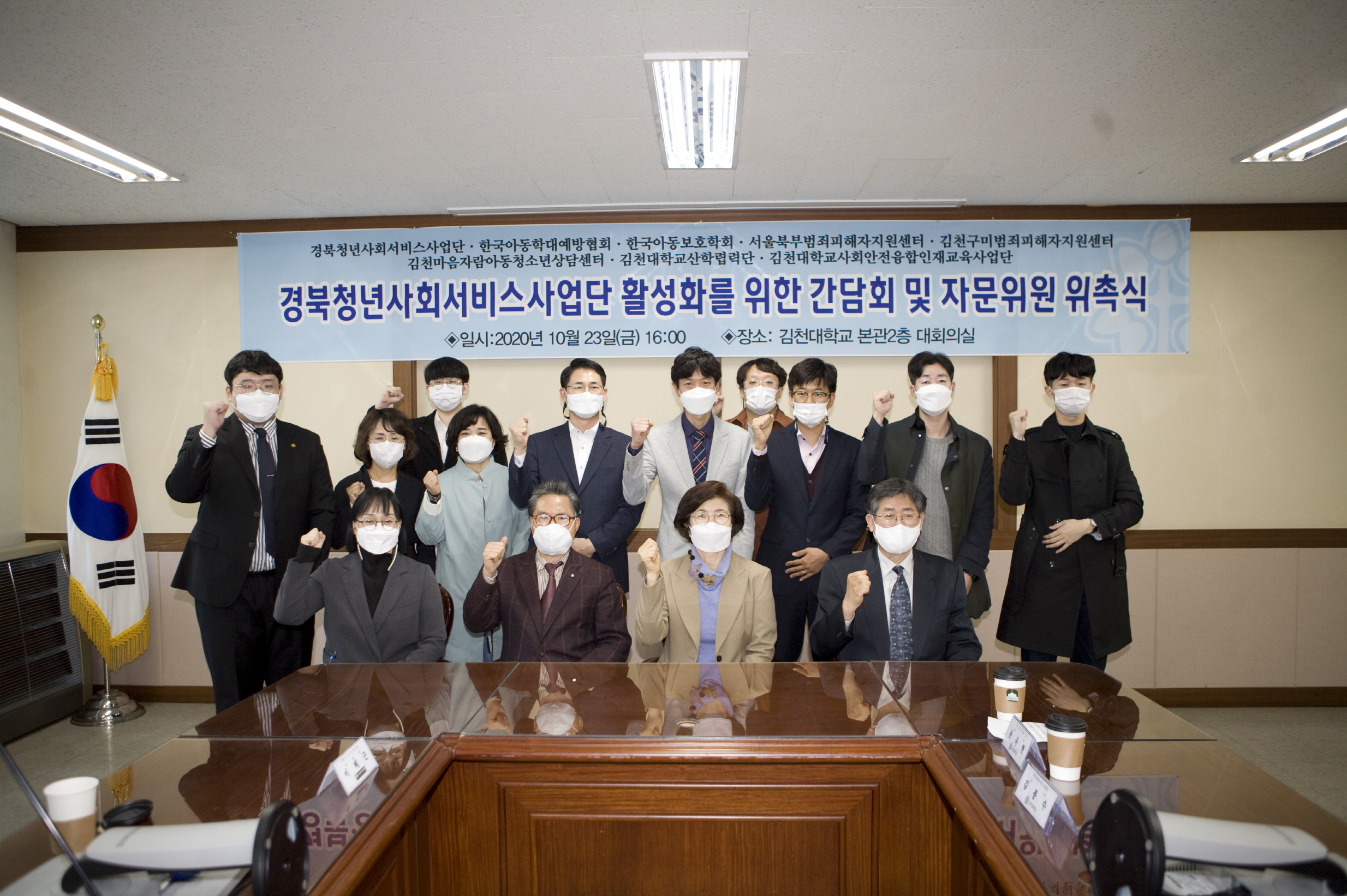 이번 간담회 및 자문위원 위촉식에는 김천대학교 윤옥현 총장,동국대학교 법과대학 강동욱 교수, 한국아동학대예방 협회 이배근 협회장, 한국아동보호학회 문영희 회장, 김천구미범죄피해자 김태자 사무처장, 김천마음자람아동센터 이명희 센터장, 서울북부범죄피해자지원센터 송귀채 사무처장, 청년사회서비스지원센터 김도현 센터장과 경북청년사회서비스 사업단 연구원들이 함께 하여 2021년 사업방향 및 자문위원 위촉식을 진행하였다.