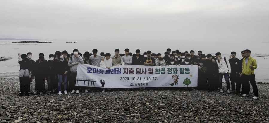 | 성의중학교(교장 안중기)는 2학년(10.21.), 1학년(10.27.) 학생이 시차를 두어 방과후학교 진로체험학습으로 호미곳 둘레길 지질 탐사와 국립등대박물관 체험학습을 하였다. 동해 바다 탐방로를 따라 퇴적암 지층과 지층의 융기·침강에 대하여 학습 자료을 활용하여 교감선생님(홍기선)이 현장 학습을 진행하였다. 퇴적 지층 사이의 바위와 퇴적물에 대하여 설명을 듣고, 학습지 퀴즈 문제를 풀면서 교실 수업과 다른 방식으로 오랜 시간에 걸친 자연의 지질 활동에 대하여 생각해 보는 계기가 되었다.