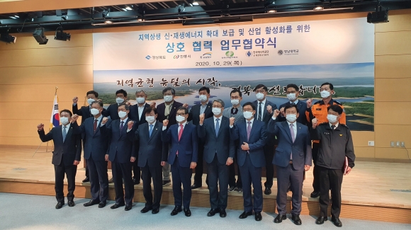 | 경상북도는 29일 안동시 세계물포럼센터에서 하대성 경상북도 경제부지사, 권영세 안동시장, 박재현 한국수자원공사 사장, 정재훈 한국수력원자력(주) 사장, 이상훈 한국에너지공단 신재생에너지센터 소장, 서길수 영남대학교 총장, 김형동 국회의원, 지역 도의원 등이 참석한 가운데, ‘지역상생 신재생에너지 확대 보급 및 산업 활성화를 위한 상호협력 양해각서(MOU)’를 체결했다.